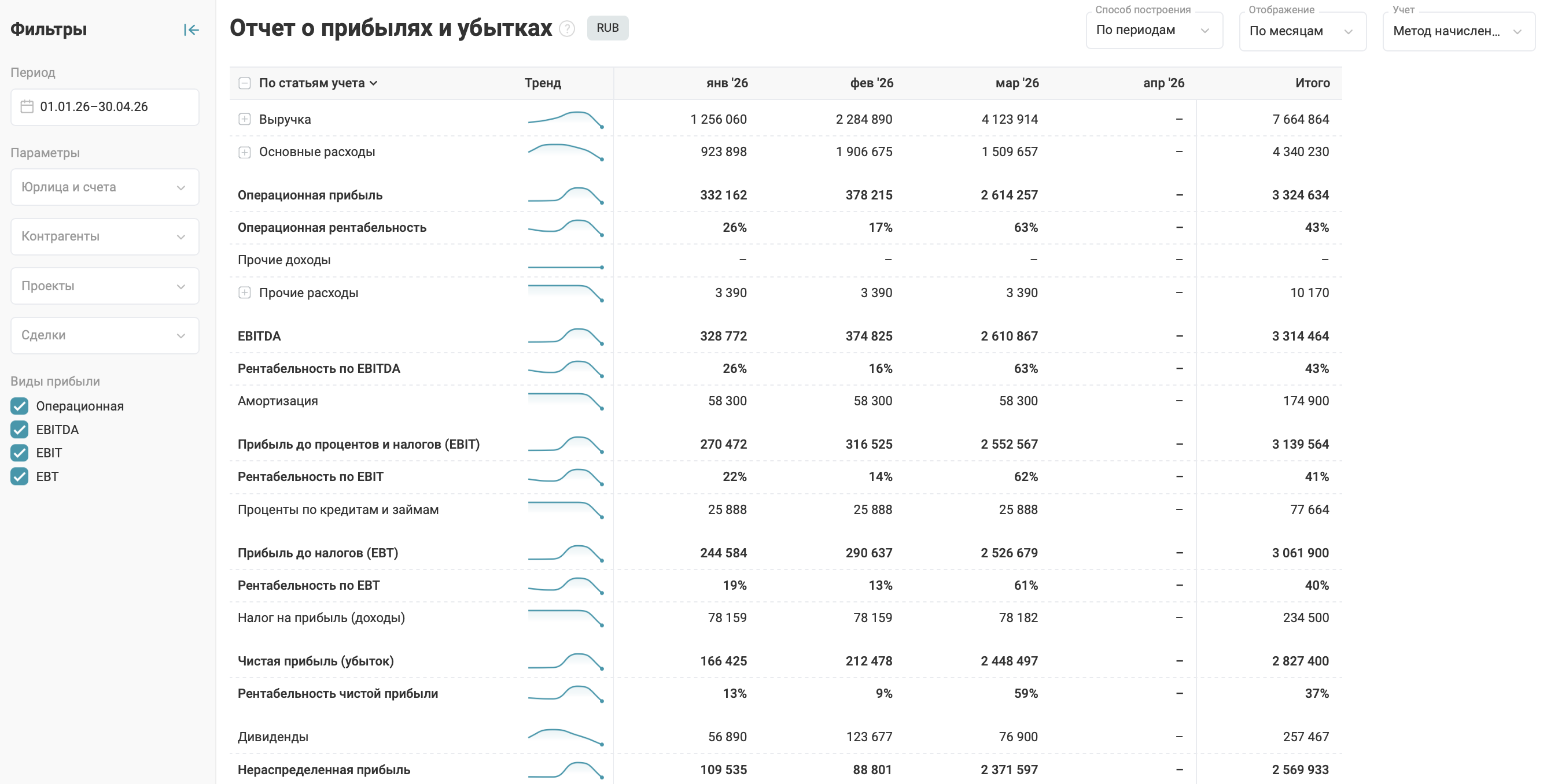 В сервисе ПланФакт автоматизирован анализ показателей рентабельности бизнеса. Не нужен ручной сбор данных, не будет ошибок в расчётах. Система собирает все необходимые показатели: доходы и расходы по статьям, ОПиУ, аналитику по проектам, направлениям, клиентам и каналам продаж и автоматически рассчитывает маржу, рентабельность продаж, EBITDA и чистую прибыль. При закрытии периода данные фиксируются, что позволяет сравнивать результаты с планом и прошлыми месяцами.