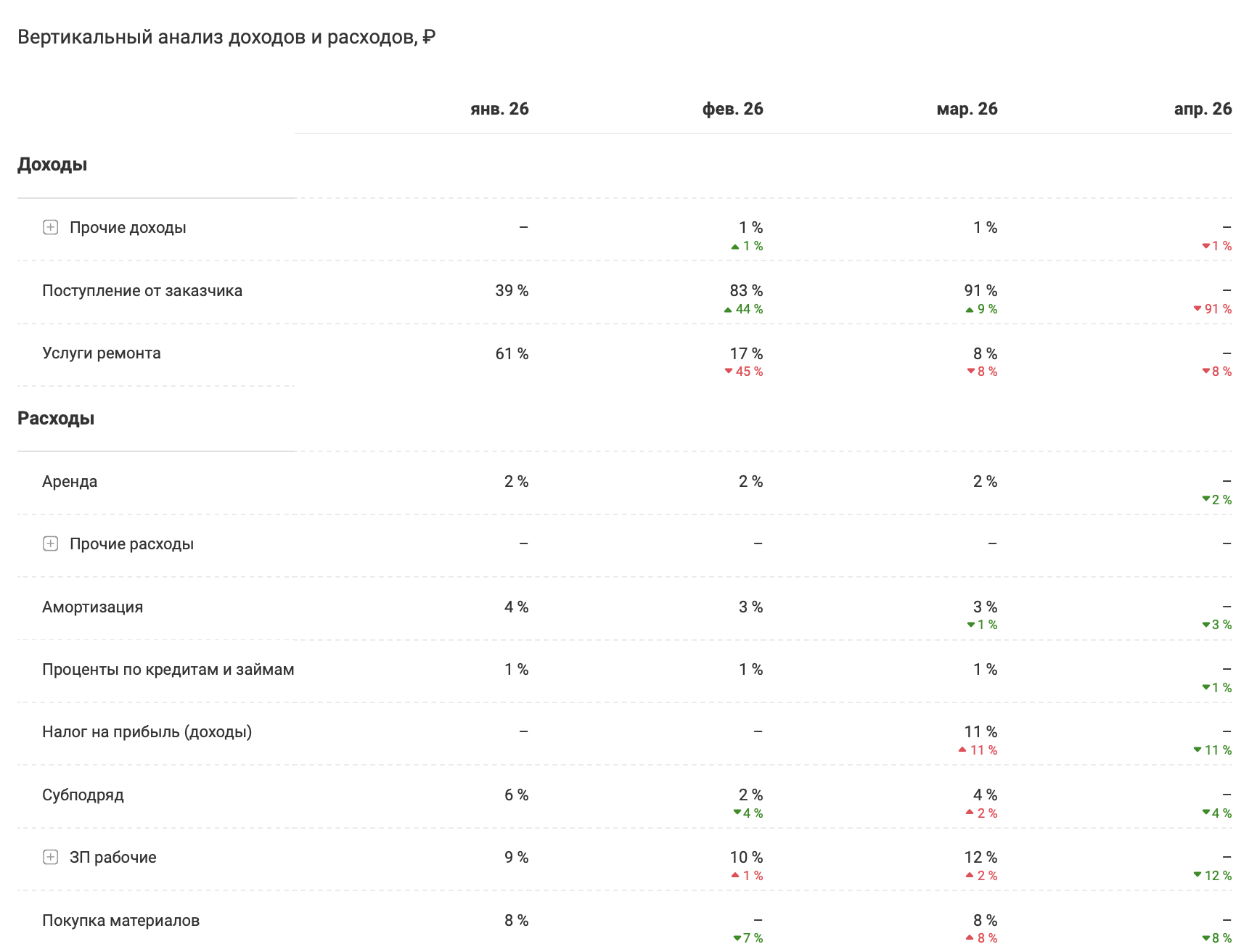 Платформа автоматически рассчитает ключевые показатели: маржу по проектам, долю расходов в выручке, операционную прибыльность. Если провести анализ периодов, то станет ясно, где упала или выросла рентабельность.