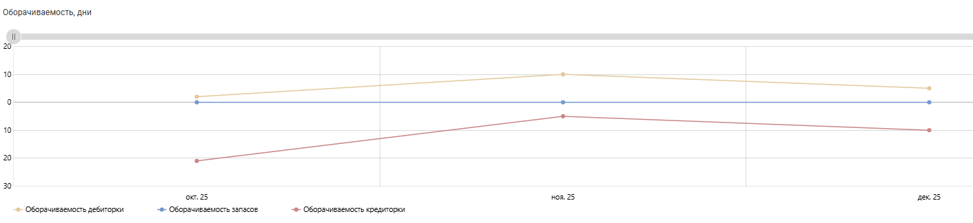На графике видно, что в ноябре повысилась оборачиваемость дебиторской задолженности, а вот оборачиваемость запасов остаётся на неизменном уровне