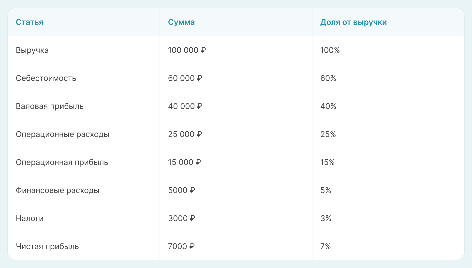 - Чистая — соотношение чистой прибыли к выручке. Она показывает, сколько чистой прибыли остаётся от выручки после учёта всех расходов.