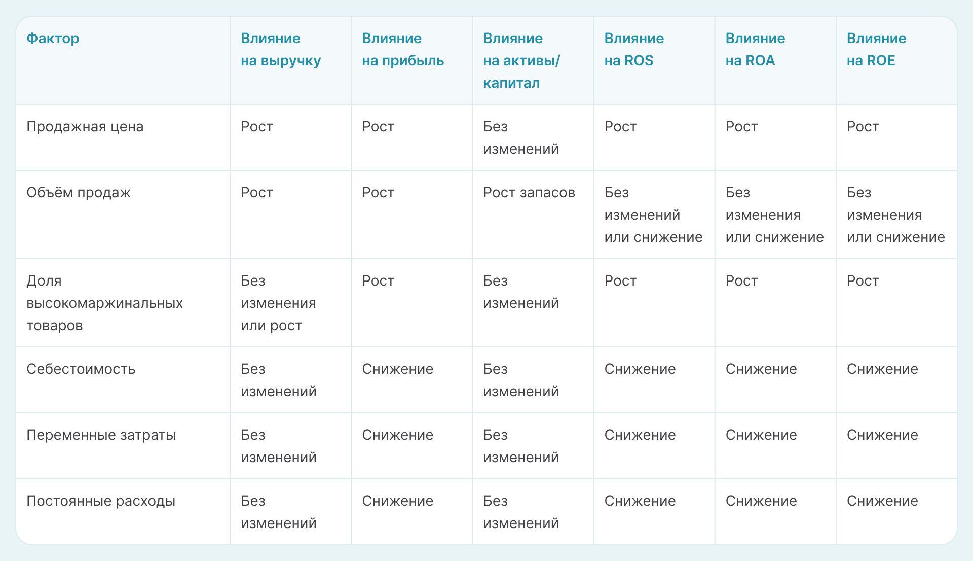 Рост продажной цены и улучшение структуры ассортимента наиболее сильно повлияли на рентабельность и компенсировали снижение объёма продаж и рост затрат.
