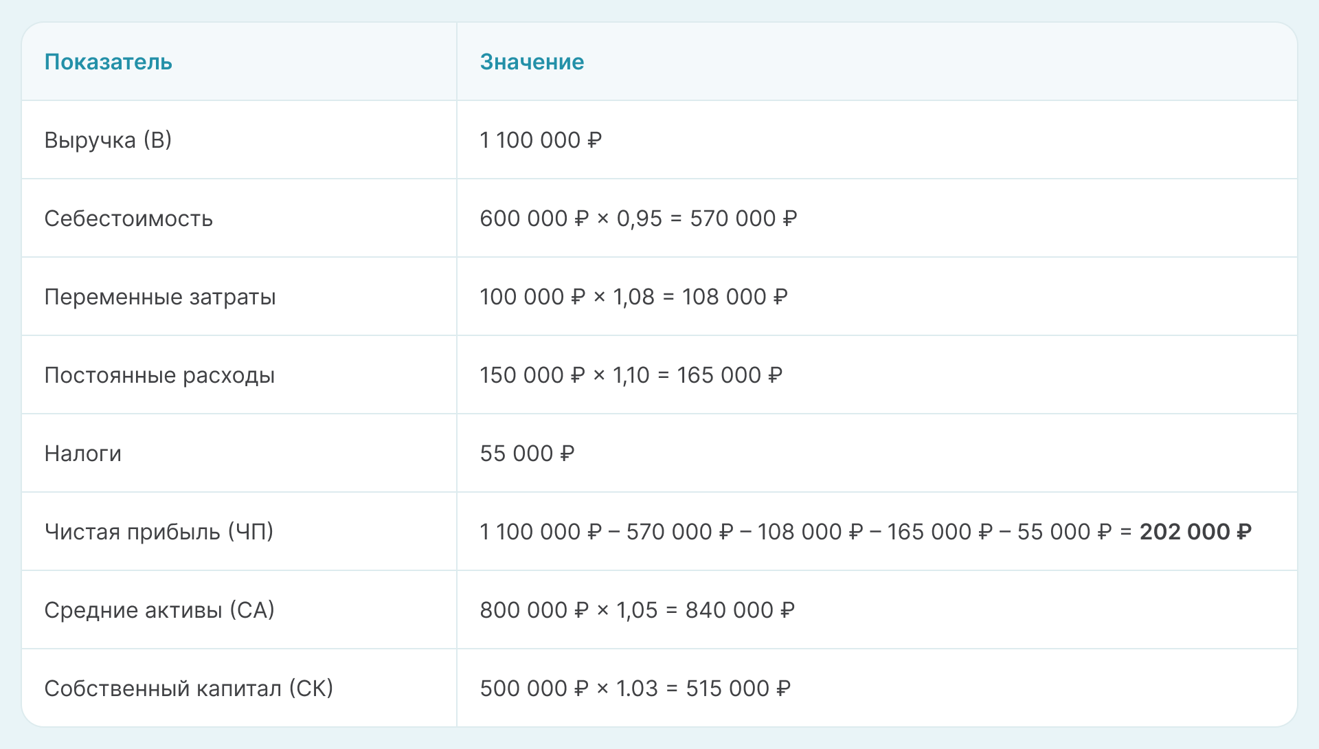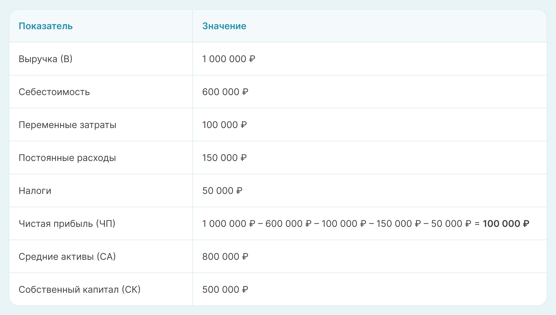 ROE = ЧП / СК = 100 000 ₽ / 500 000 ₽ = 20%.