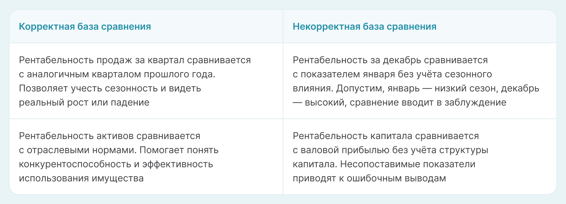 Прибыль чаще всего сравнивают с выручкой, валовую прибыль — с себестоимостью, рентабельность активов — с общей стоимостью активов, а рентабельность капитала — с собственным капиталом. Правильный выбор базы влияет на информативность анализа. Если взять некорректную пару для сравнения, то результат такого анализа бессмыслен.