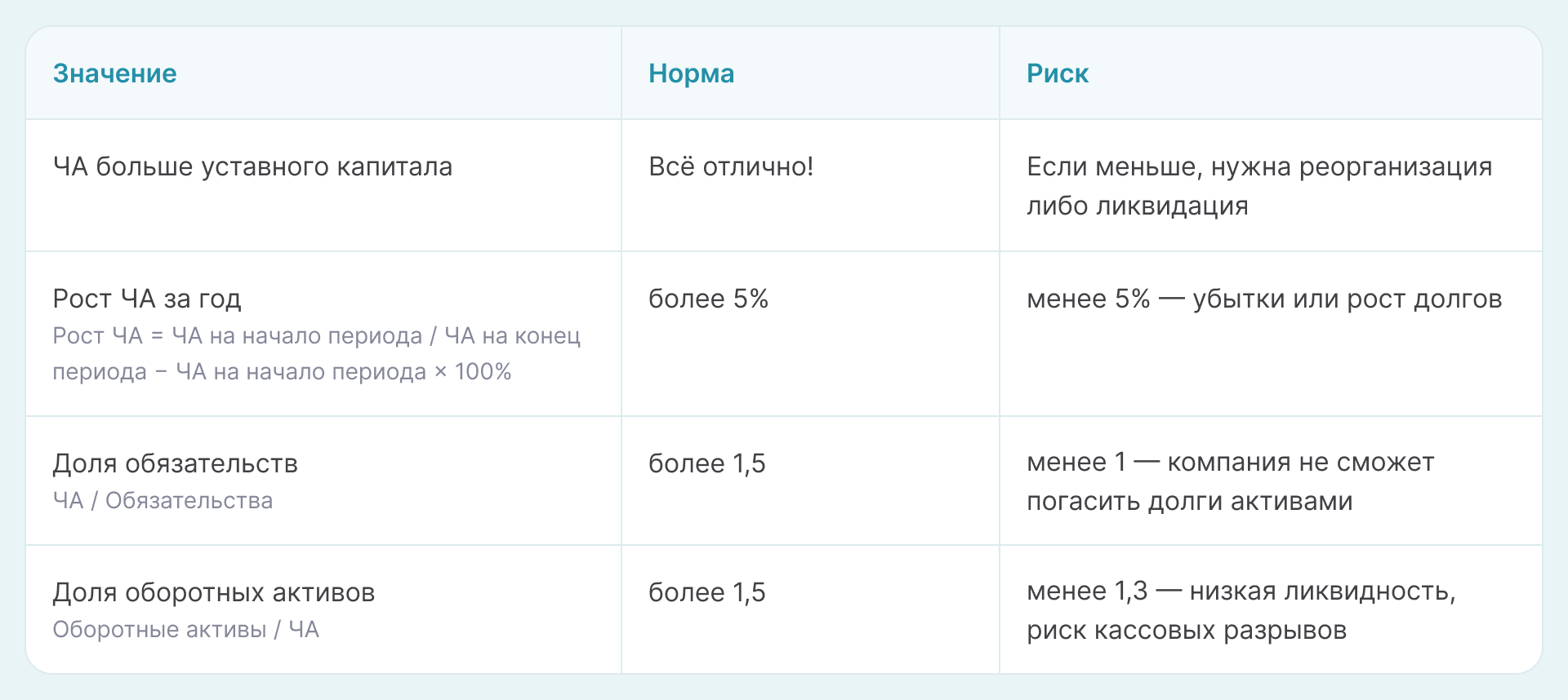 Если значение чистых активов в балансе положительно и увеличивается, бизнес укрепляется, если отрицательно, появляется риск неплатежеспособности. Чем выше их значение, тем больше у бизнеса ресурсов для преодоления кризисов. Банки и инвесторы оценивают чистые активы при выдаче кредитов или покупке доли компании.