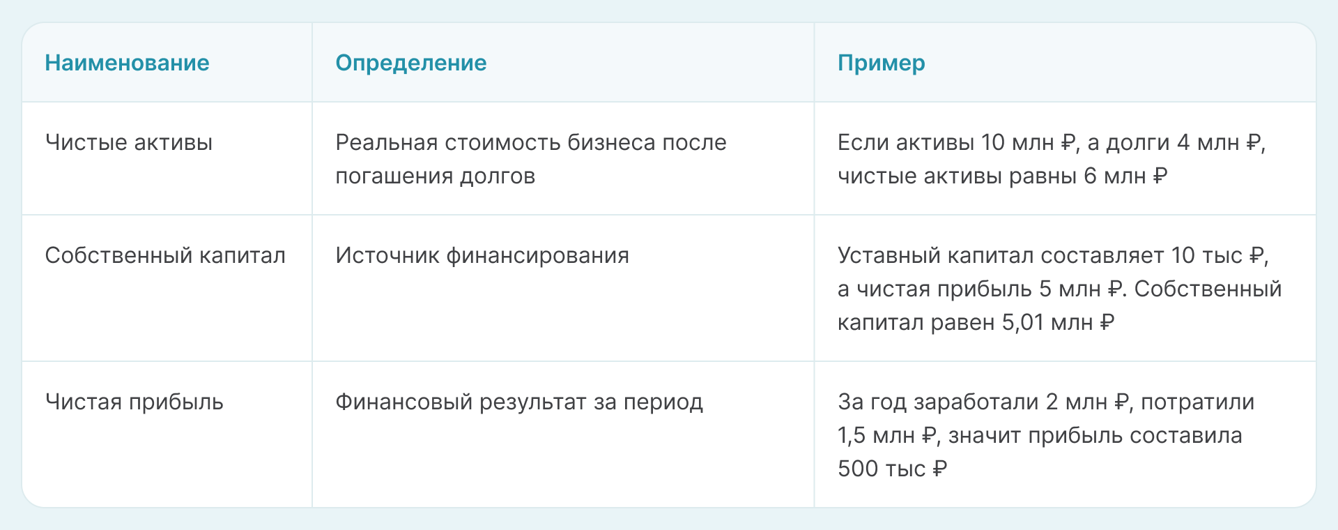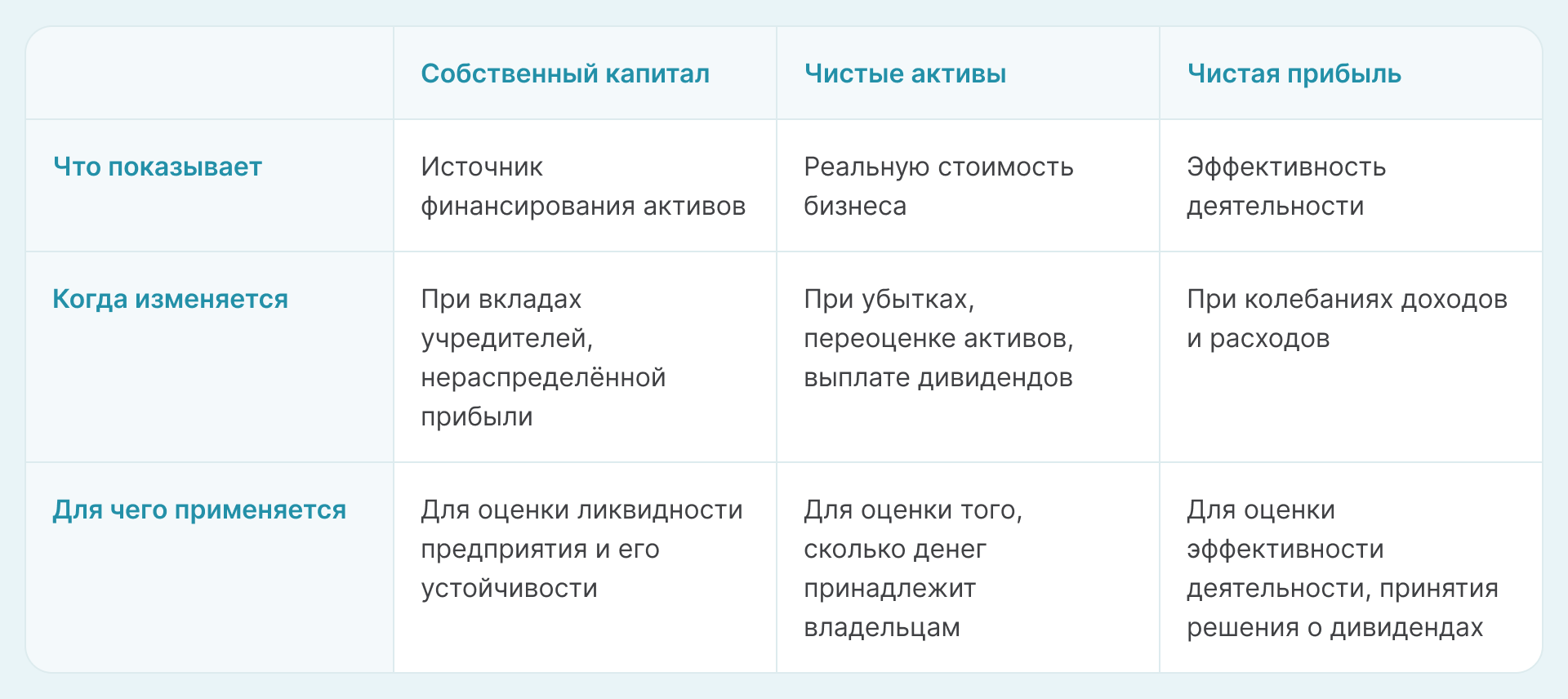 Рассмотрим в таблице отличия между чистыми активами, собственным капиталом и чистой прибылью.