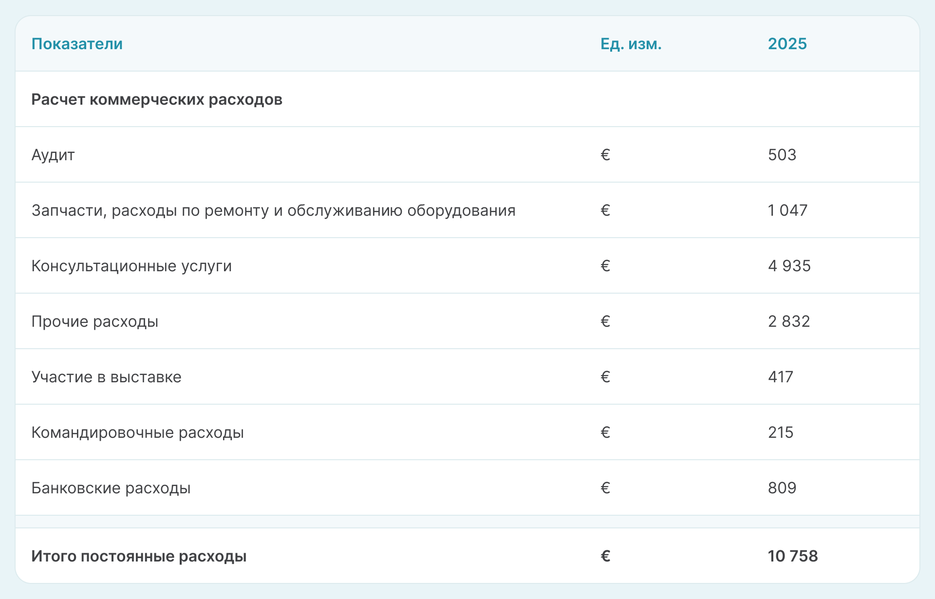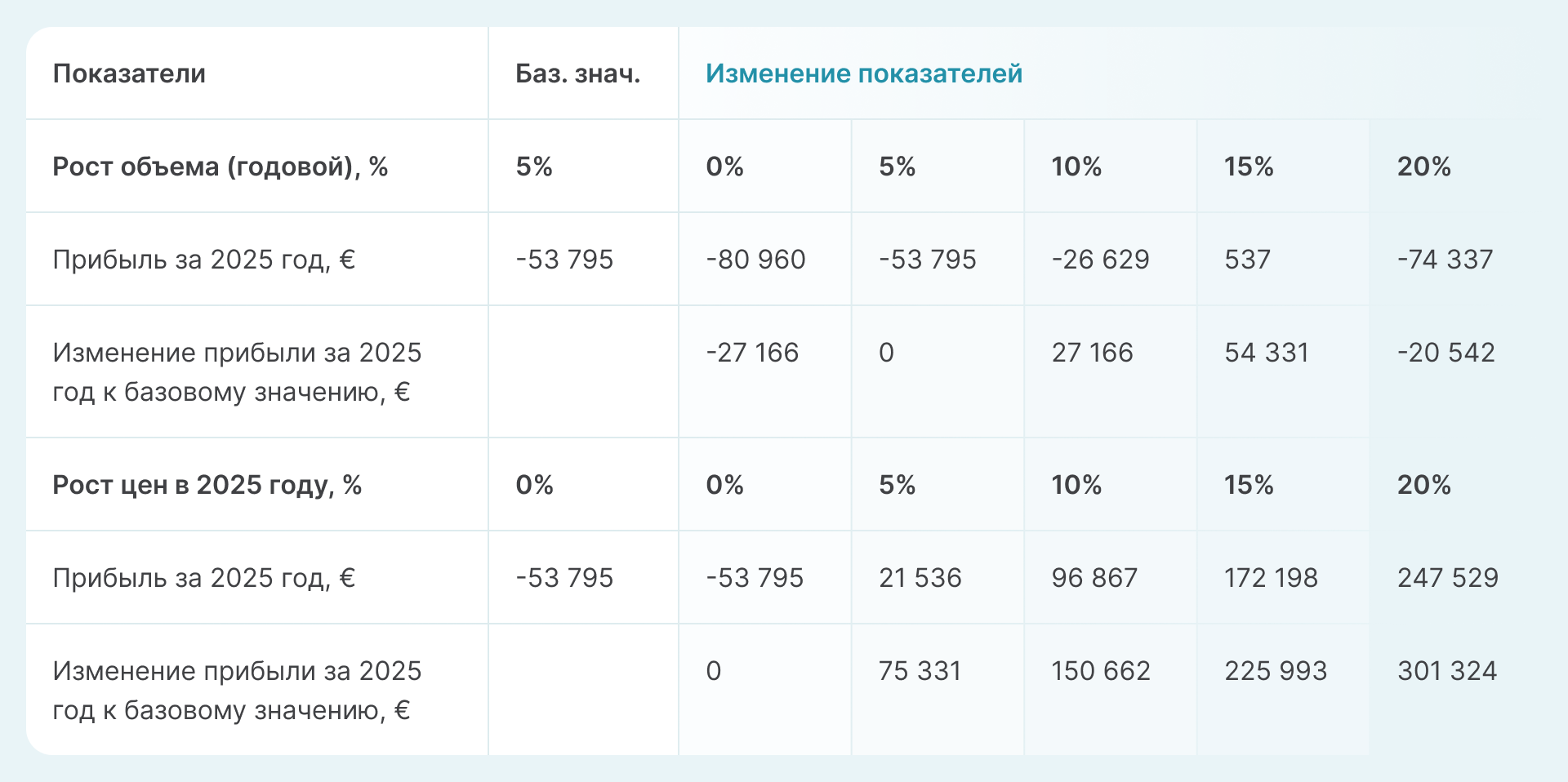 - При росте цены даже на 5%, компания в 2025 году выйдет на положительный результат по прибыли и увеличит ее на 75 000 евро.