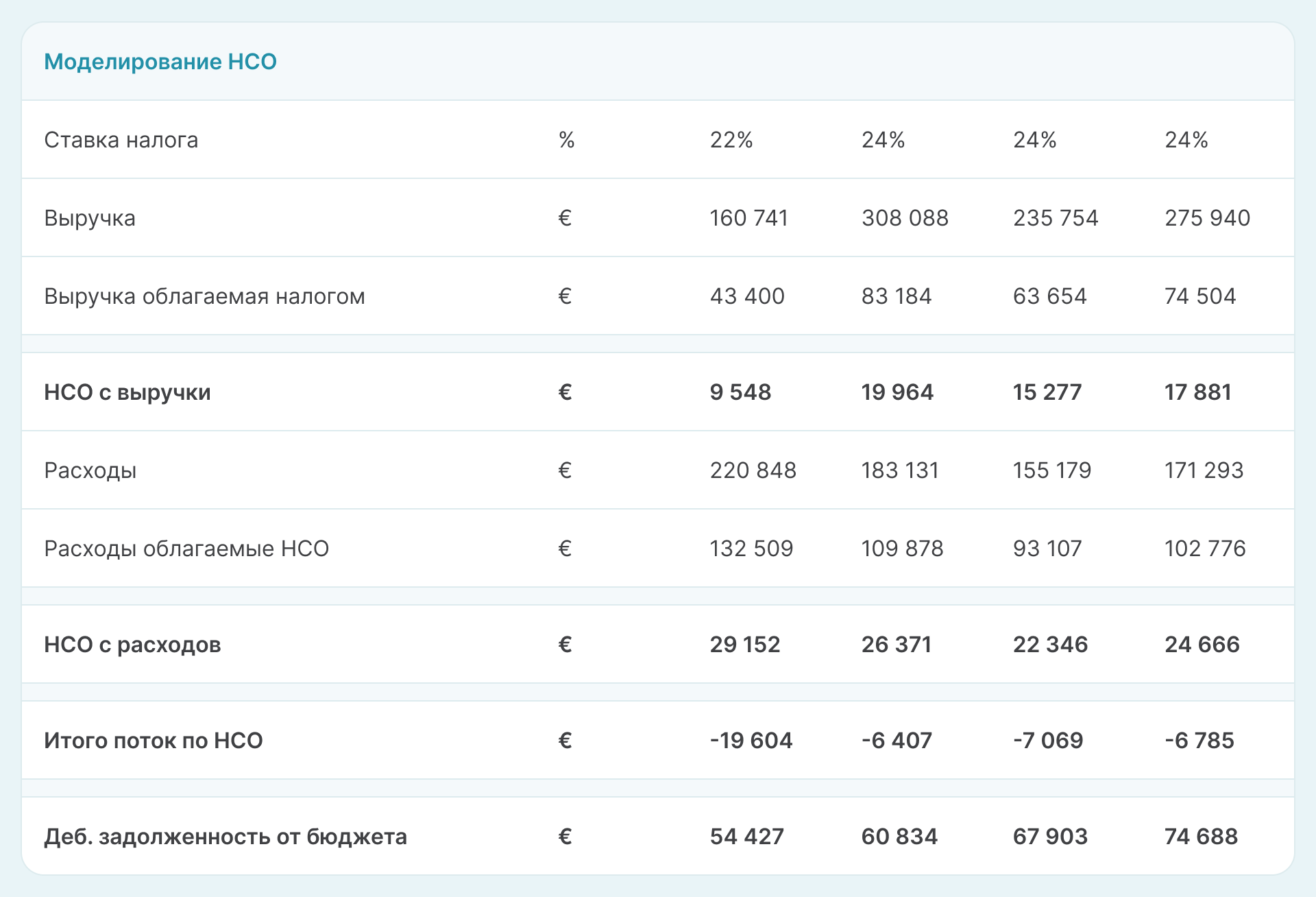 7. Моделирование налога с оборота (НСО). Компания выплачивает в бюджет разницу между НСО, полученным от клиента, и НСО, уплаченным самой компанией. Если выручка, облагаемая НСО оказалась меньше, чем облагаемые налогом расходы, возникает дебиторская задолженность из бюджета.