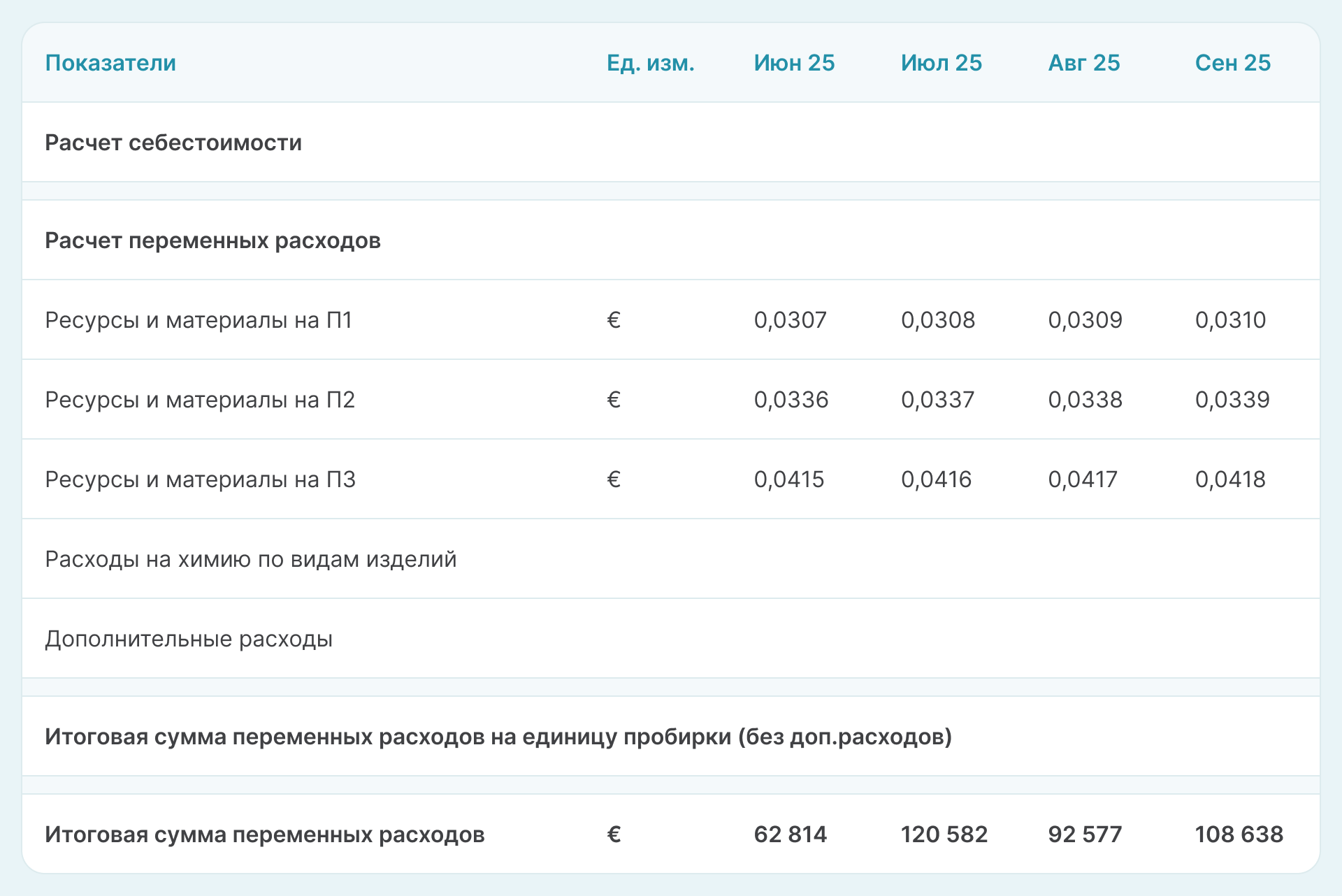 2. Переменные расходы для каждого вида оборудования и расходника. Учитывали затраты на сырье, материалы и ресурсы для производства единицы продукции.