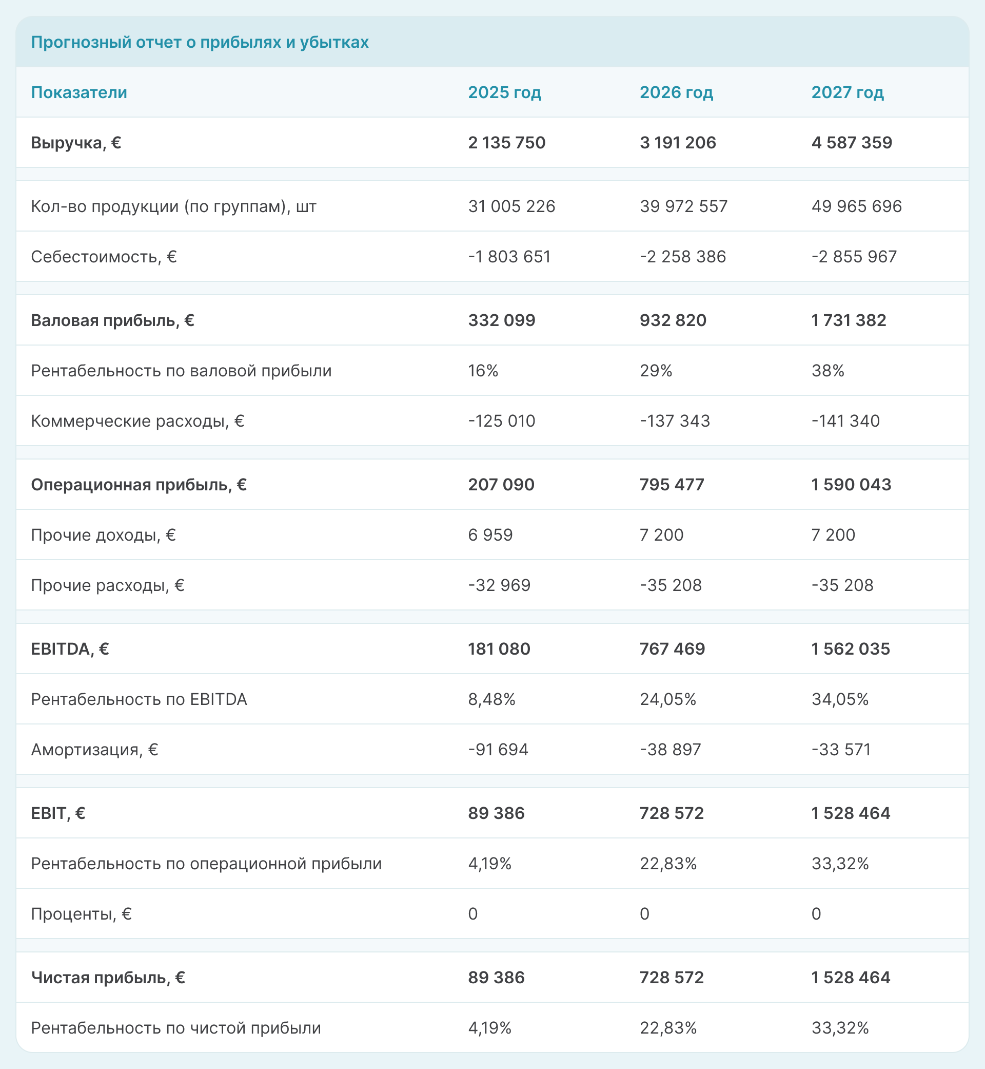 - При пессимистичном сценарии компания за 3 года получит убыток 50 000 евро и кассовые разрывы в 2026–2027 году.