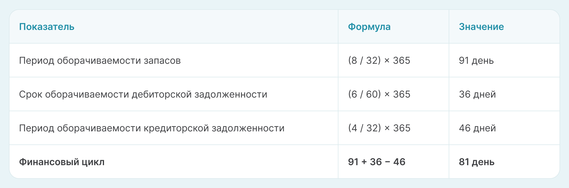 Финансовый цикл = период оборачиваемости запасов + срок оборачиваемости дебиторской задолженности − период оборачиваемости кредиторской задолженности.