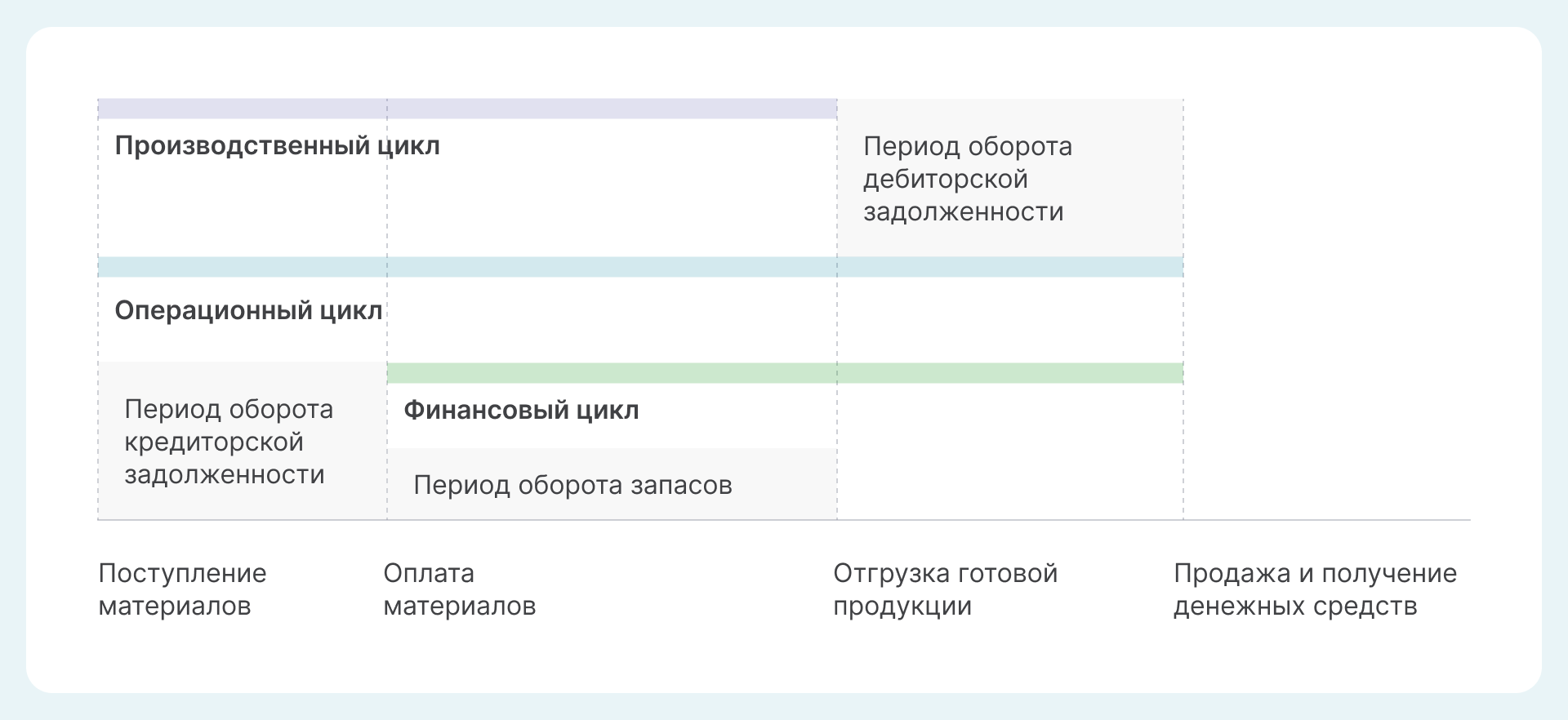 Операционный цикл показывает, сколько времени деньги находятся в бизнес-процессах, а финансовый — сколько из этого периода компания должна финансировать сама. Разница между ними — это кредиторская задолженность.
