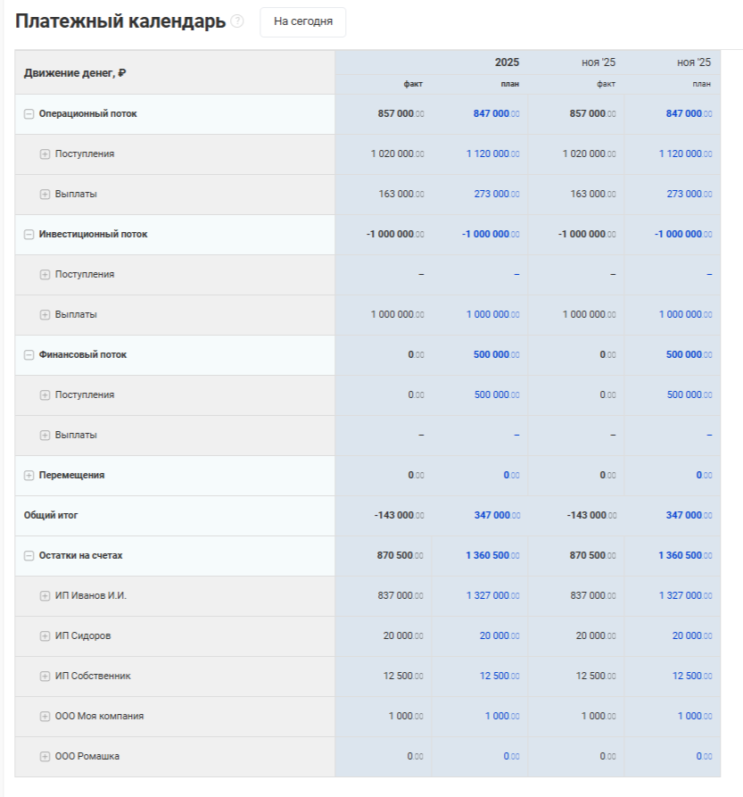 Сервис собирает три основных отчета: ДДС, ОПУ и Баланс. Через платежный календарь удобно отслеживать будущие платежи, что помогает минимизировать кассовые разрывы, а в бюджетах сравнивать формирующийся факт с выставленными плановыми значениями.