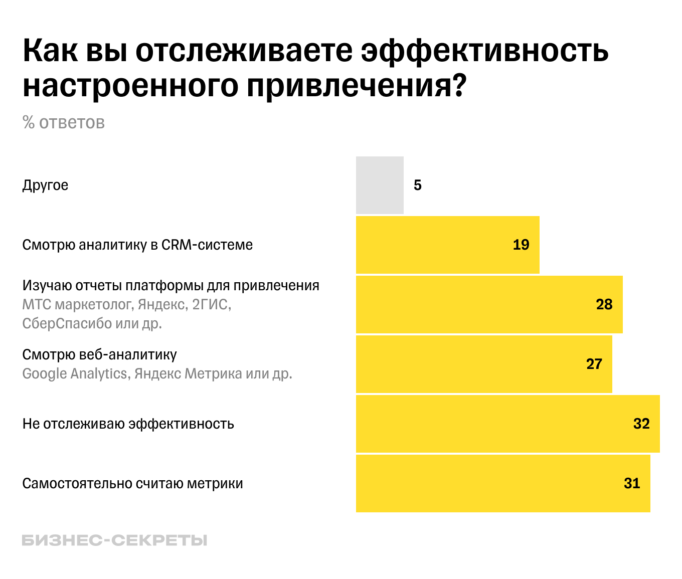 Продвижение с малым бюджетом окупается только тогда, когда понятно, что именно работает. Но 32% предпринимателей вовсе не отслеживают эффективность рекламы, а еще 31% — смотрят только часть показателей.