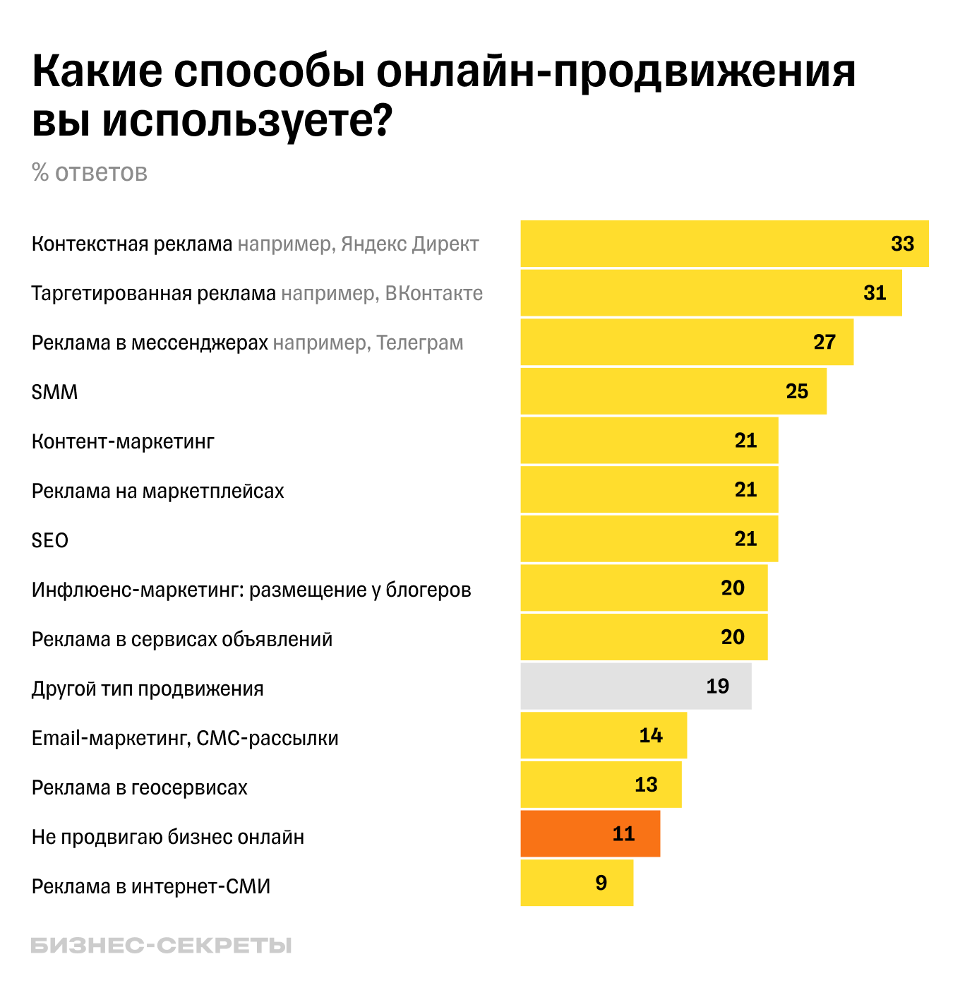 Когда бюджет ограничен, важно выбирать те каналы, которые дают понятный и измеримый результат. Исследование Бизнес-секретов показывает: сегодня предприниматели делают ставку в первую очередь на цифровые инструменты. Самые популярные каналы онлайн-продвижения — это контекстная реклама, таргетированная реклама и реклама в мессенджерах.