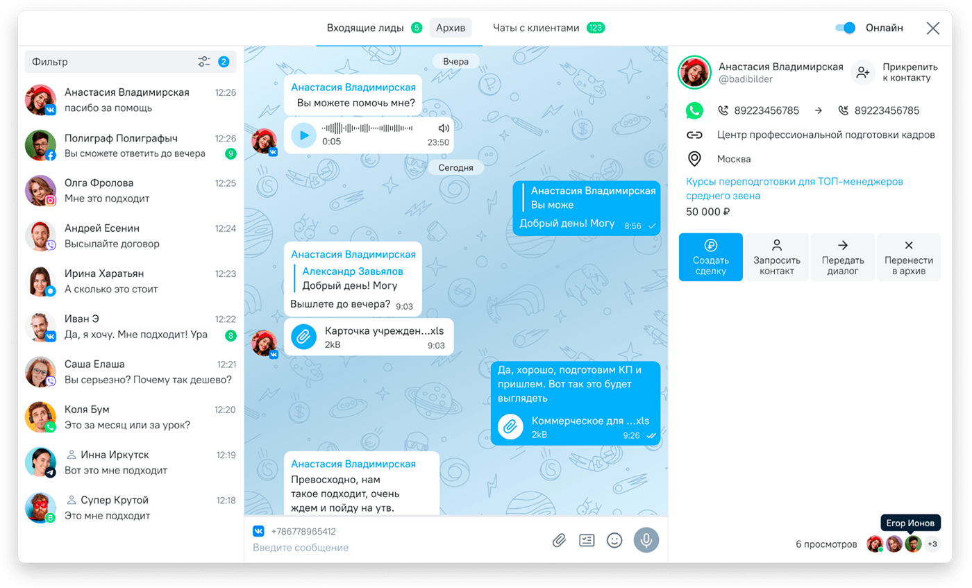 Например, вот так в OkoCRM выглядит чат с клиентами — сюда попадают все обращения из Telegram, Avito, ВК, WhatsApp*