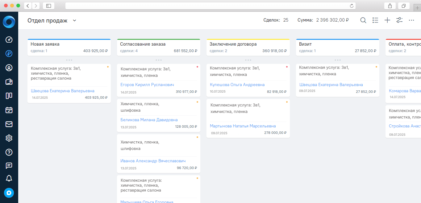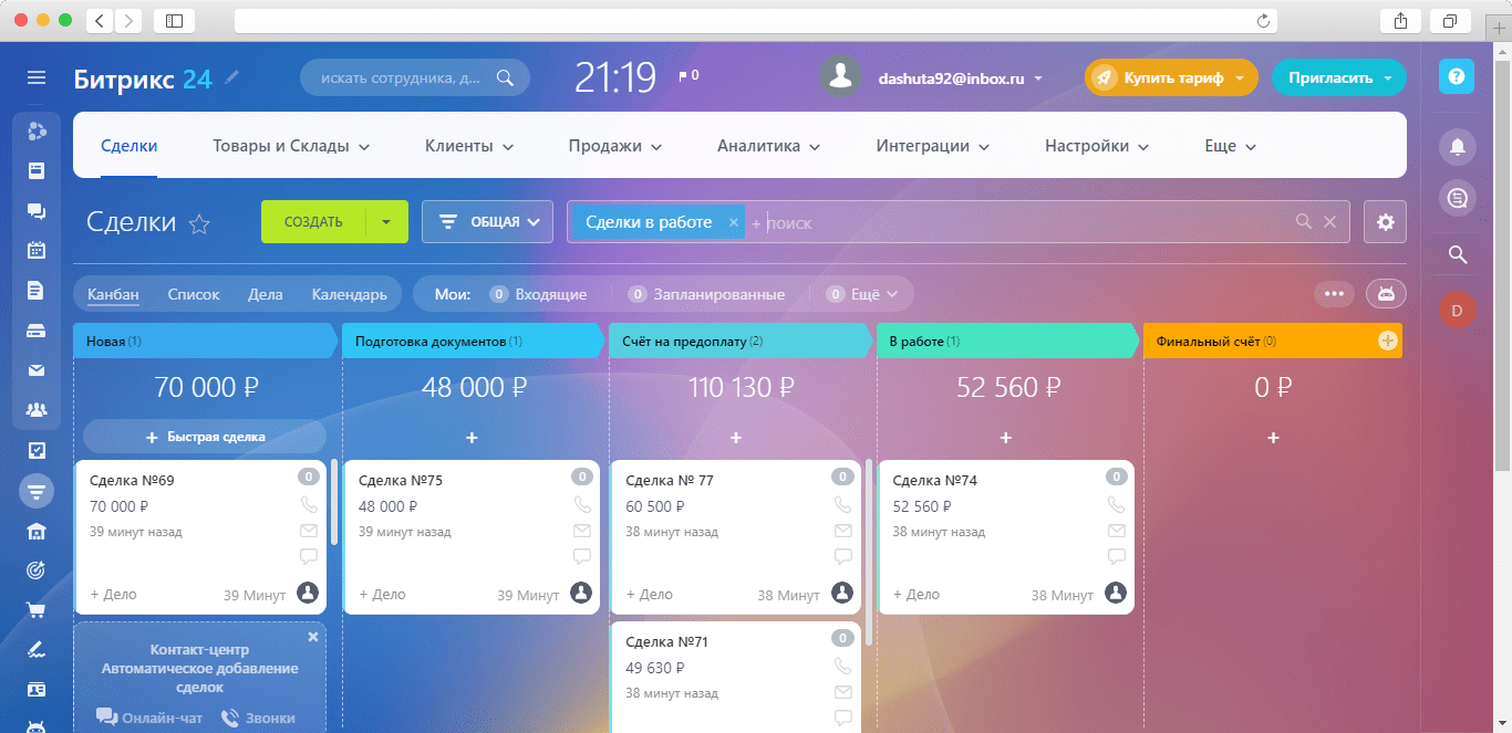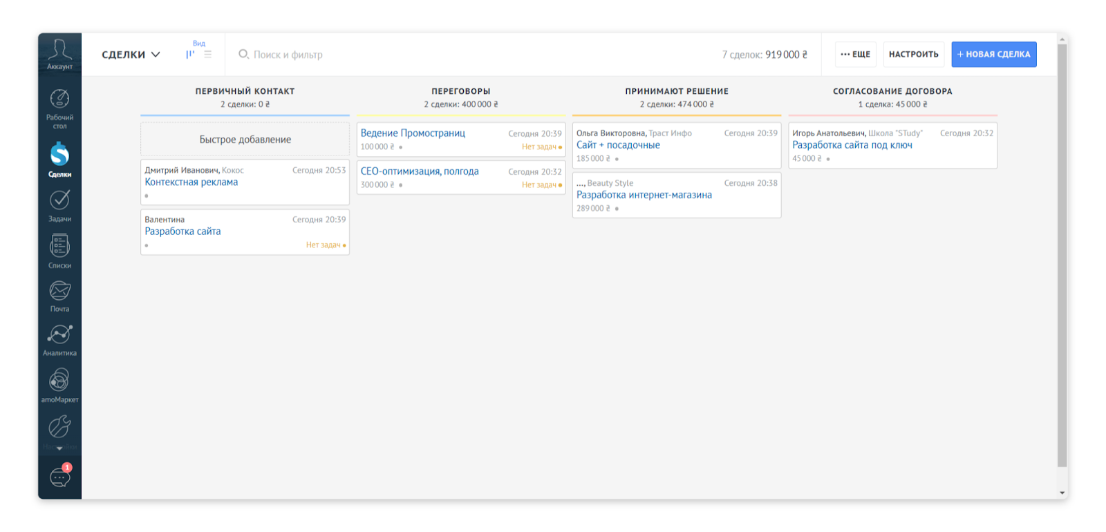 Интерфейс amoCRM: канбан-доска со сделками