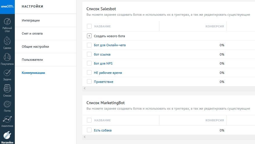 Пример настройки ботов в системе. Источник: amocrm.ru