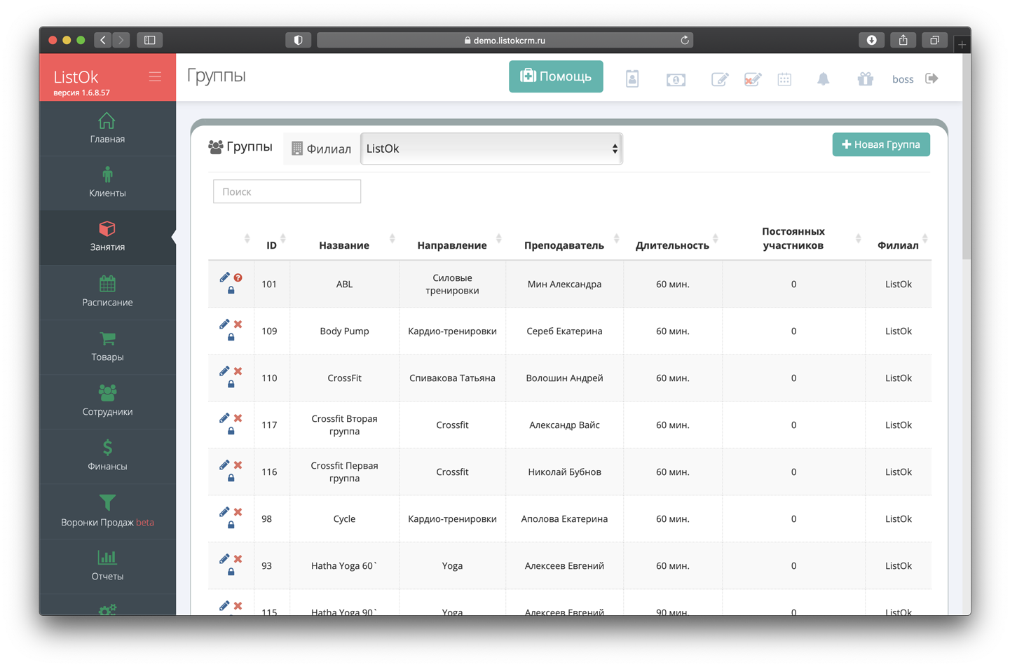 - Ведение групп. Можно создавать виды занятий (йога, стретчинг, танцы), фиксировать их длительность и назначать преподавателей. Группы будут отображаться в расписании.