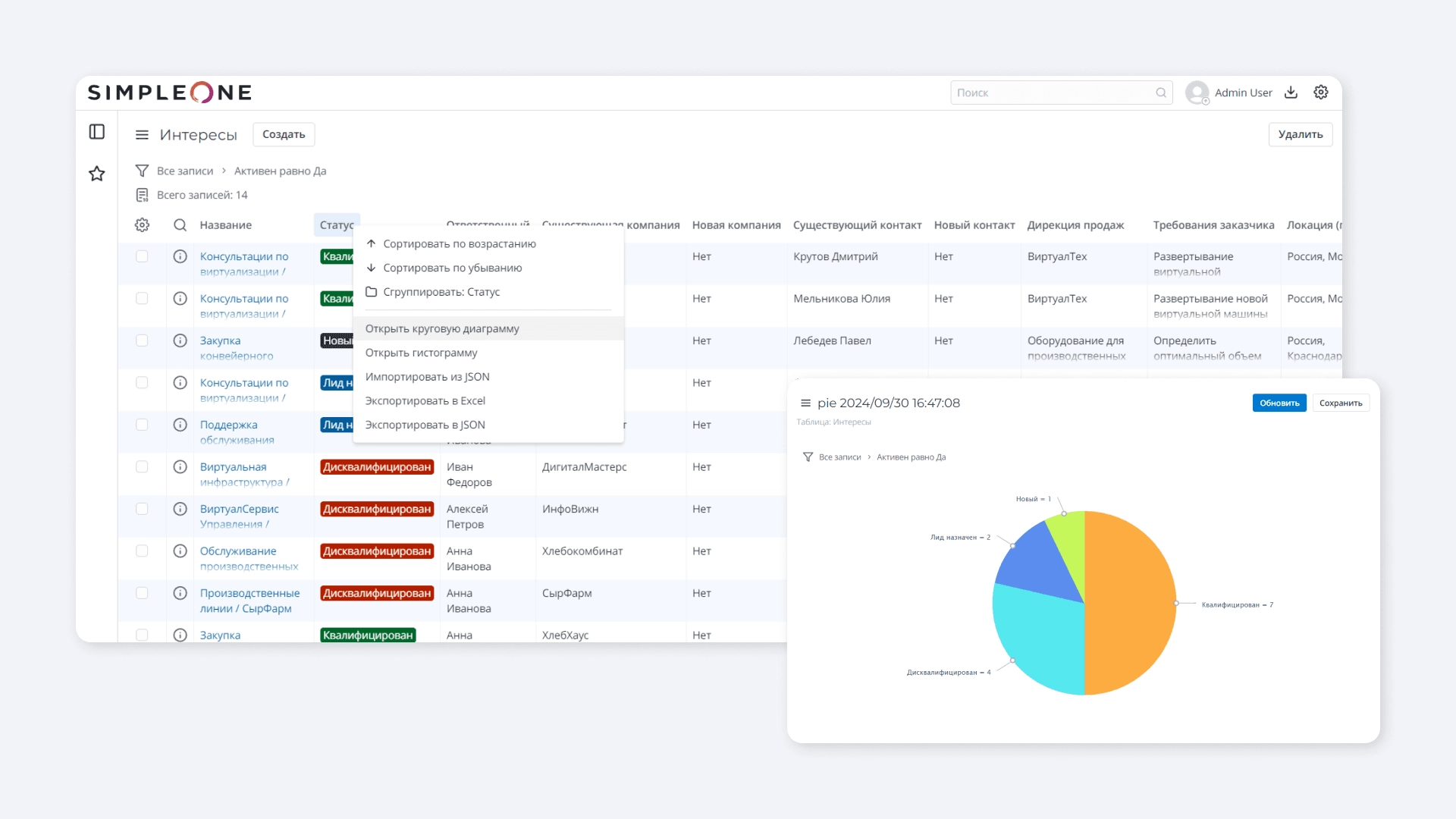 В SimpleOne B2B CRM можно настраивать отчёты. Здесь есть разные инструменты для визуализации данных по продажам и рекламным кампаниям: графики, диаграммы, таблицы.