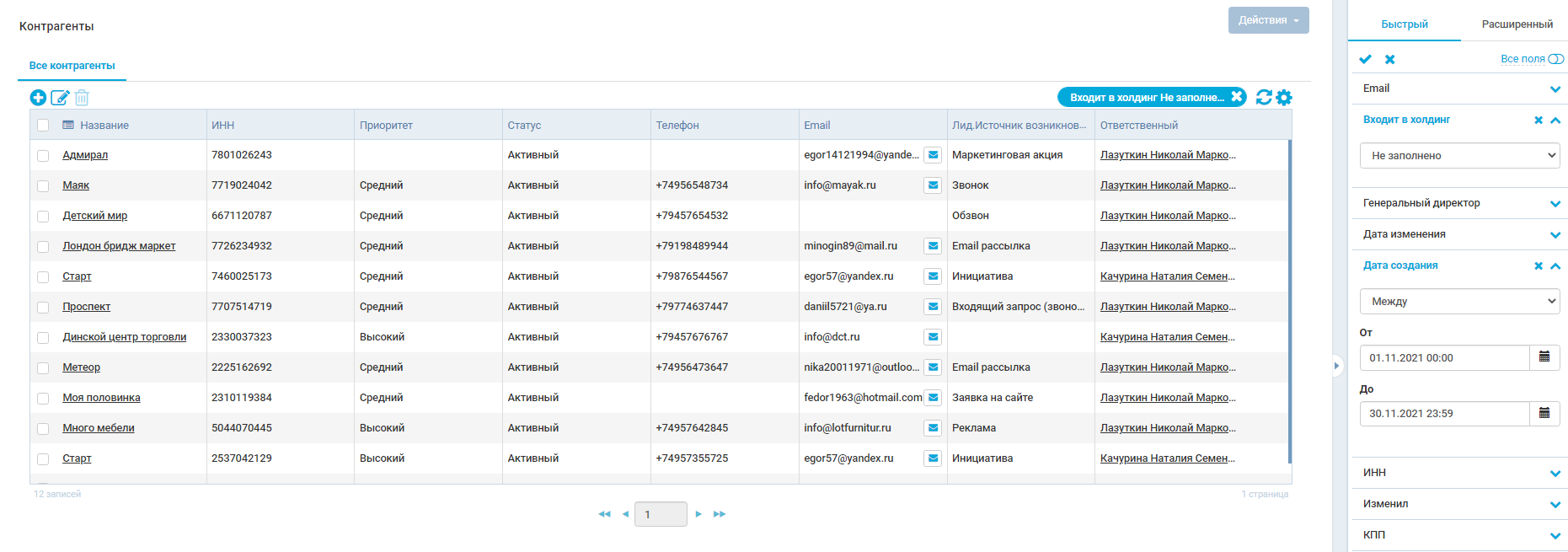 - Клиентская база. Здесь бизнес хранит карточки клиентов. В них — контакты, сделки с покупателем, история переписки и всех точек касания. В карточках хранят любую информацию, которая важна для бизнеса.