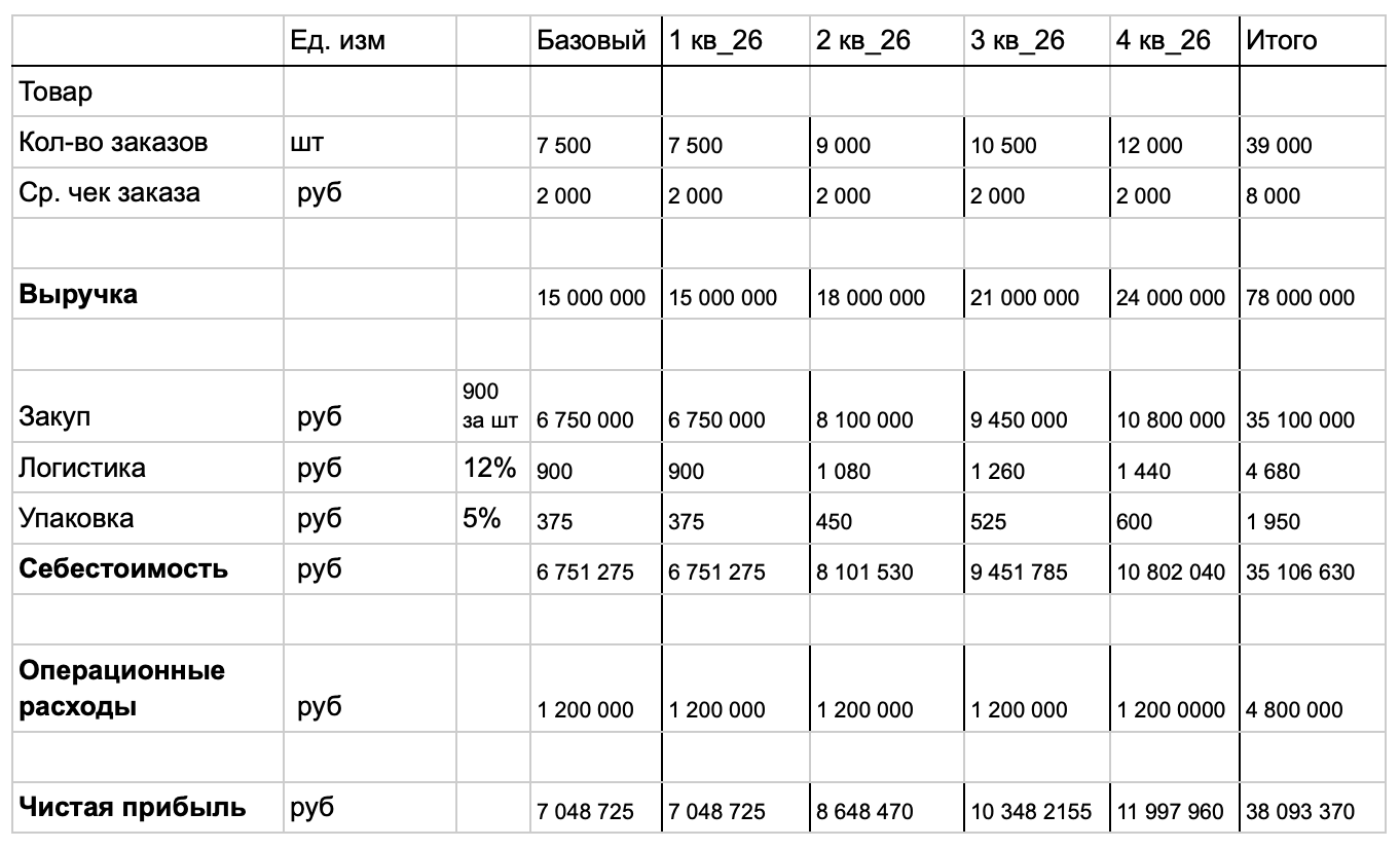 Предполагаем, что ежеквартально мы будем прирастать в объеме продаж по 20% от базового значения (при условии неизменности остальных параметров), что позволит нам увеличить выручку по итогу 4 квартала 2026 года с 15 до 24 млн рублей, а в чистой прибыли с 7 до 12 млн рублей.