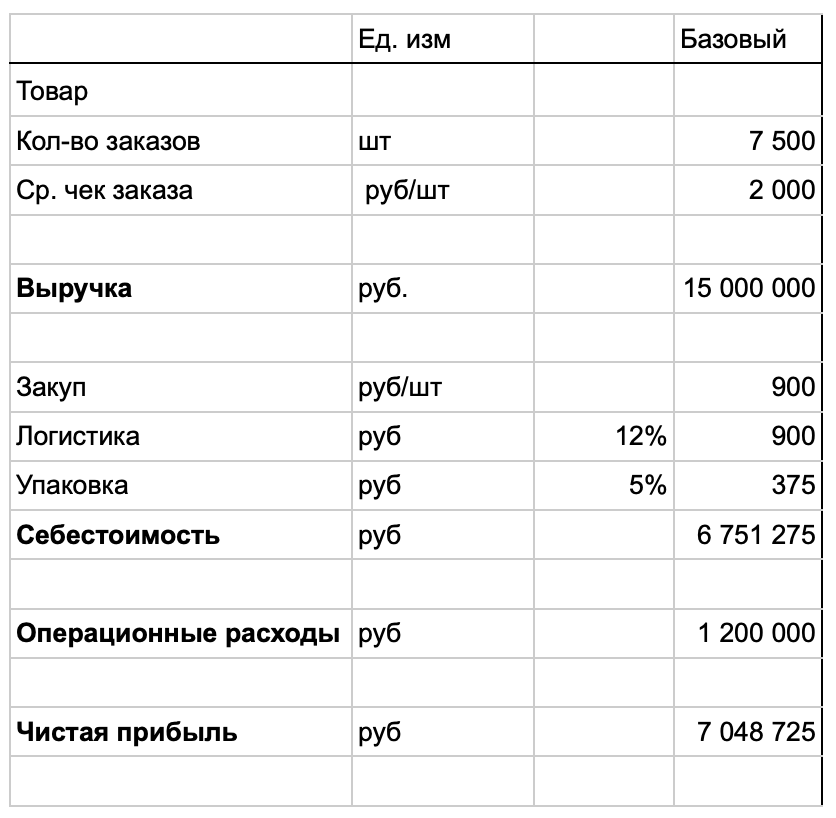 - Анализ влияния операционных расходов и себестоимости. В базовом сценарии себестоимость существенно влияет на прибыль. Анализ данных показывает, что логистика и упаковка имеют процентное соотношение от объема продаж. Также , несмотря на неизменность, важно регулярно анализировать операционные расходы на предмет возможностей для оптимизации.