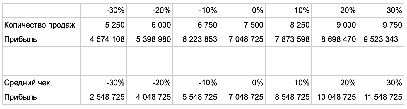 Изменения в среднем чеке, при прочих равных, оказывают существенное влияние на прибыль. Увеличение на 20% или 30% приводит к значительному росту прибыли, особенно при росте количества продаж. Увеличение количества продаж также положительно влияет на прибыль.