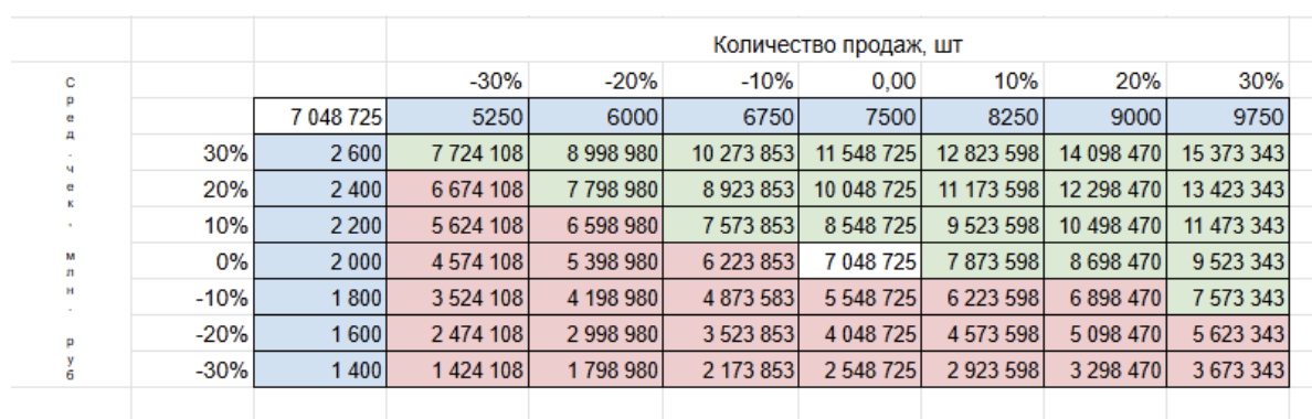 Диапазон сценариев чувствительности (таблица 3) охватывает как снижение, так и рост: объем − 30%…+ 30%, средний чек − 30%…+ 30%. Максимальная зафиксированная прибыль в представленных сценариях достигает примерно 11,5 млн рублей, минимальная — порядка 2,5 млн рублей в зависимости от сочетания спадов.