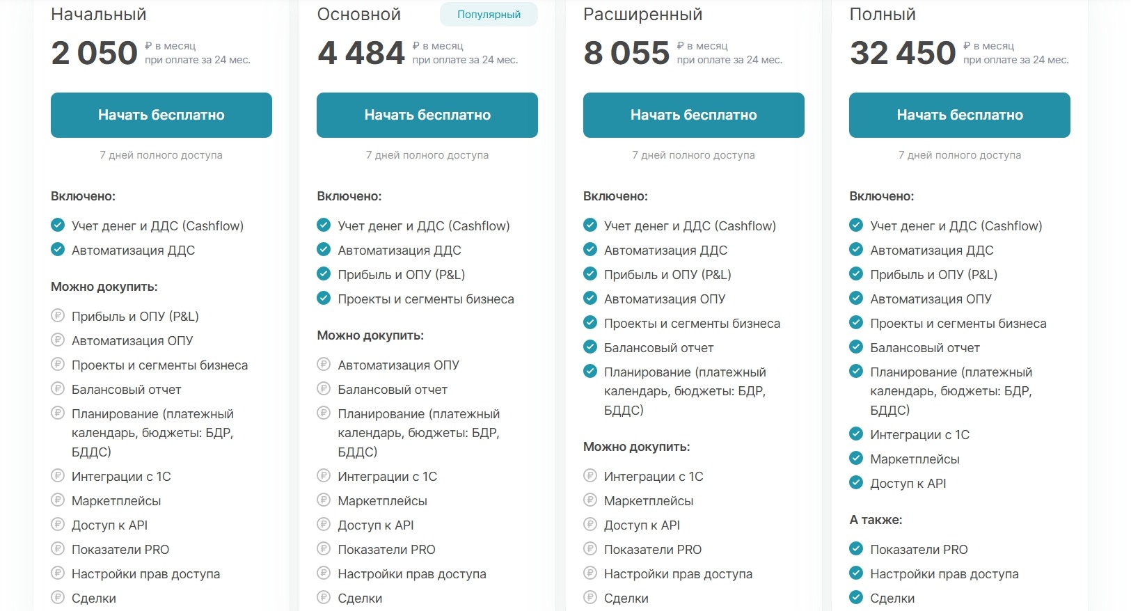 Всего есть 4 тарифа. «Начальный» подходит небольшим компаниям или стартапам, так как позволяет автоматизировать и контролировать движение денежных средств. Если нужны дополнительные отчеты или интеграции с маркетплейсами, выбирают более дорогостоящие тарифы. Также отдельные инструменты можно докупить — это удобно, когда нужно добавить пару функций к выбранному тарифу.