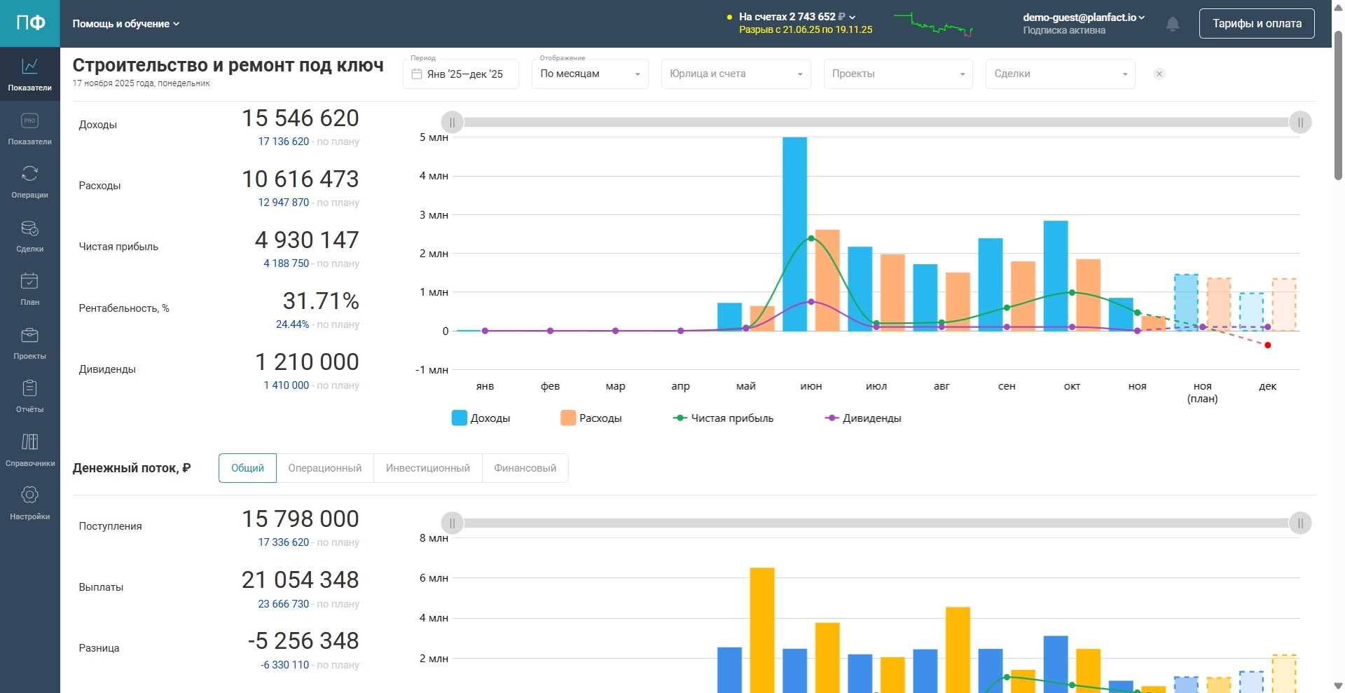 Сервисы для финансового анализа помогают держать все важные цифры под рукой, что упрощает контроль финансов. Для этого в ПланФакт есть дашборды, на которых отображаются ключевые показатели бизнеса: денежный поток, структура расходов, остатки на счетах.