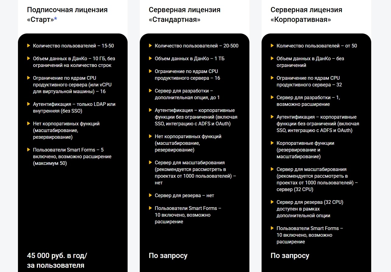 Есть три тарифа, которые отличаются количеством пользователей и смарт-форм, объемом данных и наличием некоторых функций.