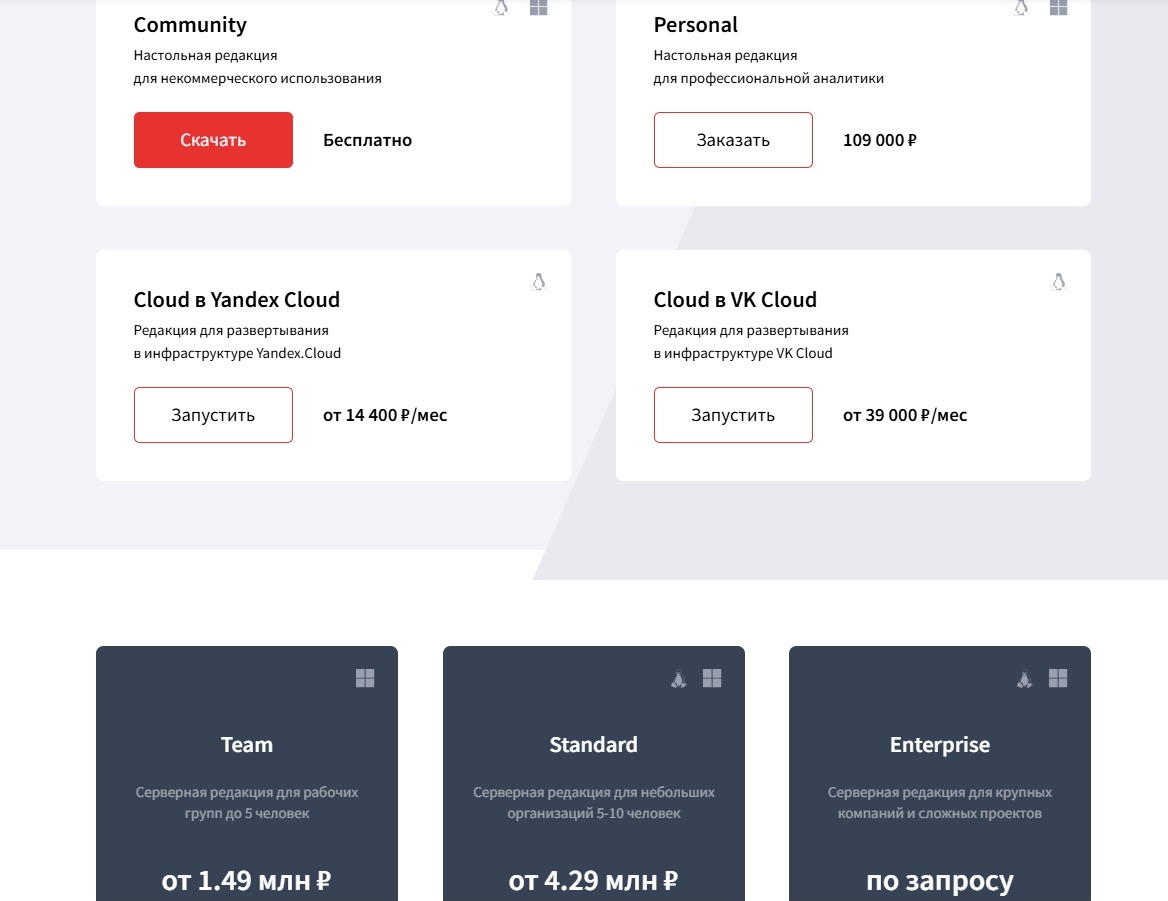 Стоимость Loginom зависит от выбранного решения. Например, редакция для развертывания в Yandex Cloud стоит от 14 400 ₽ в месяц, а в VK Cloud — от 39 000 ₽ в месяц. Настольная редакция для некоммерческого использования полностью бесплатная.