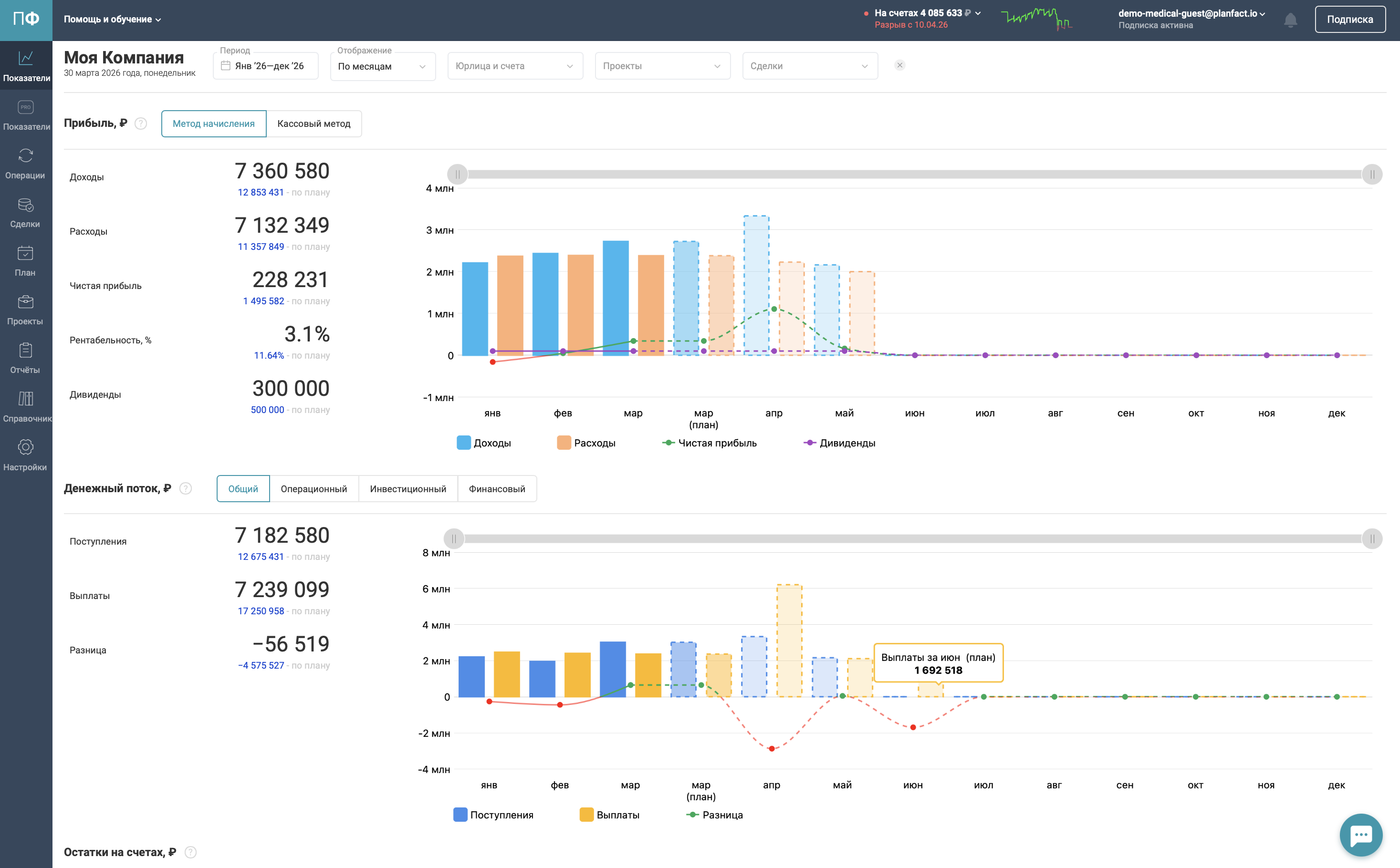 ПланФакт — облачный сервис управленческого финучета для малого и среднего бизнеса. С его помощью можно собрать все данные финансовые данные в одном месте и видеть, сколько зарабатывает бизнес, куда уходят средства и сколько их остается. Отдельный акцент — на контроле кассовых разрывов: сервис заранее показывает, когда могут возникнуть проблемы с ликвидностью.