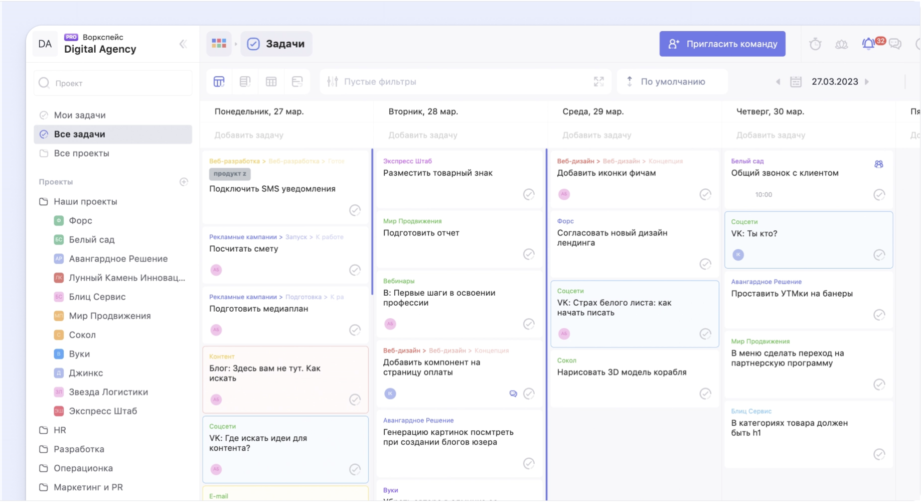 - Гибкие форматы планирования: канбан, список, календарь, недельный план.