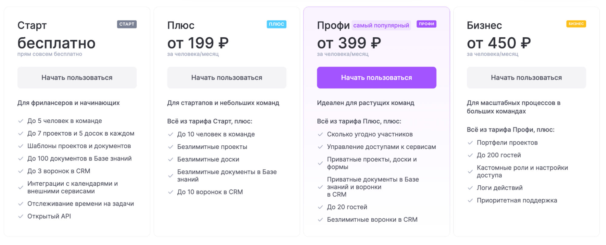 Цена. Есть бесплатный тариф для команд до 5 человек. Платные тарифы — от 199 ₽ за пользователя в месяц.