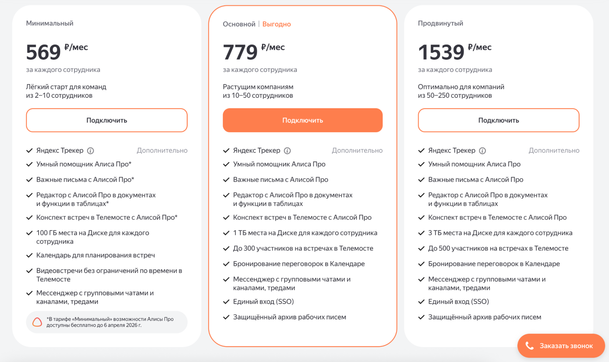 Цена. Доступен только в составе платных тарифов Яндекс 360 для бизнеса, от 569 ₽ за пользователя в месяц (в зависимости от пакета).