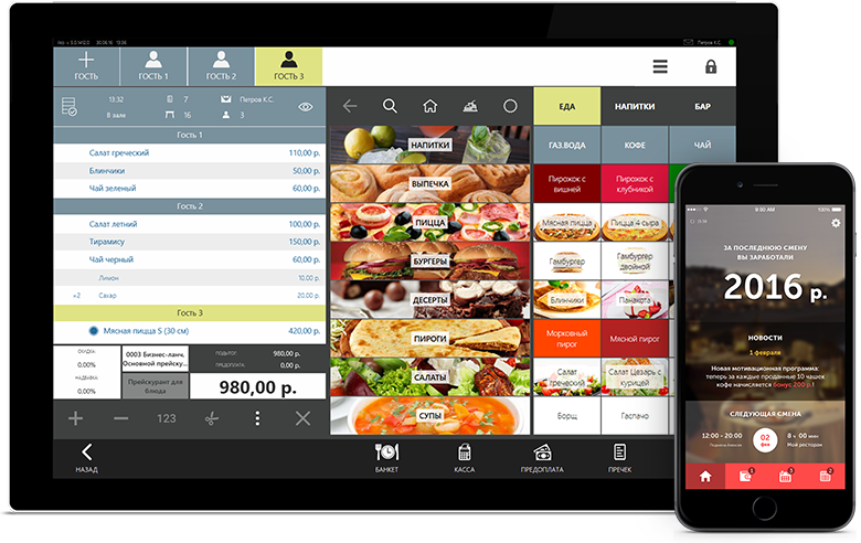 - Касса и фронт-офис: оформление заказов, работа со столами, скидки, бонусы и акции.