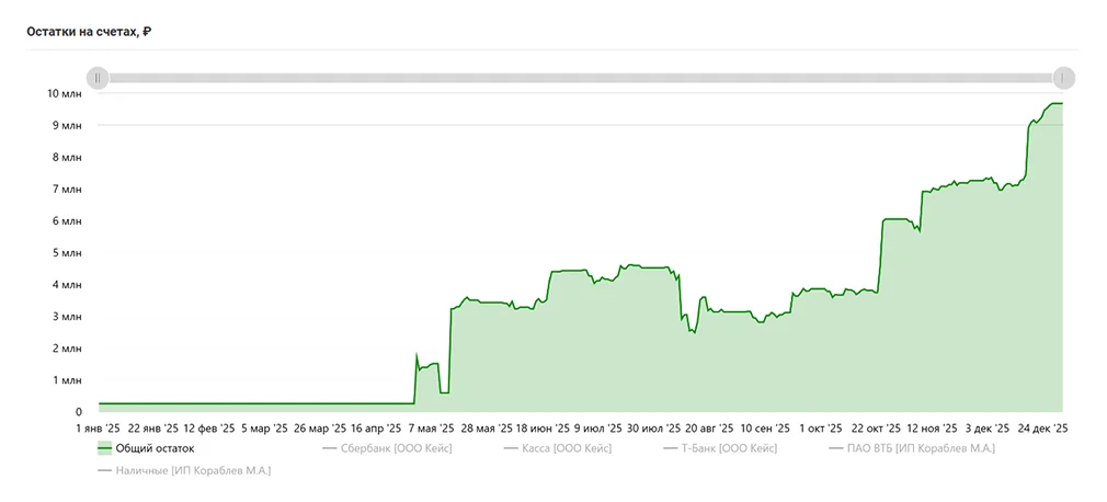 Они помогают сразу увидеть тренды, визуальное соотношение поступлений и выплат, как меняются остатки на счетах